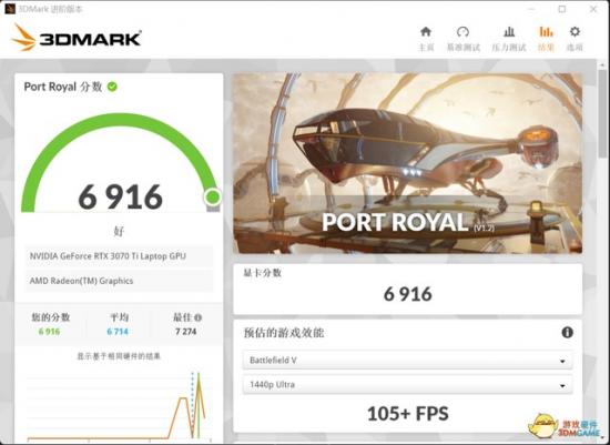 RTX实时光追理论性能的PortRoyal项目得分6916分,可见安培架构中第二代的RT Core性能效率确实提高很多。