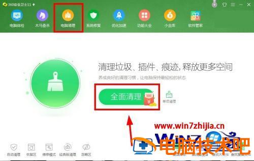 1、首先打开360安全卫士,点击“电脑清理”选项,选择“全面清理”。