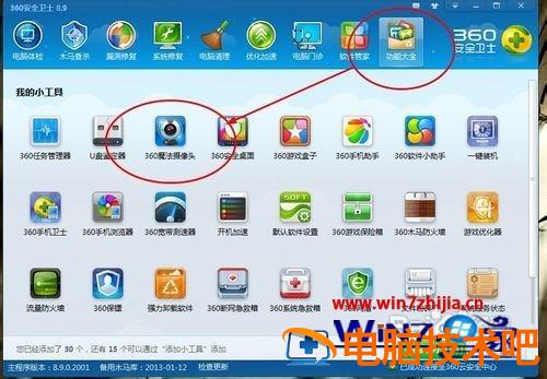 1、如果你的电脑安有360安全卫士的话,那么就很方便了。打开360安全卫士,进入功能大全界面添加360魔法摄像头功能即可。