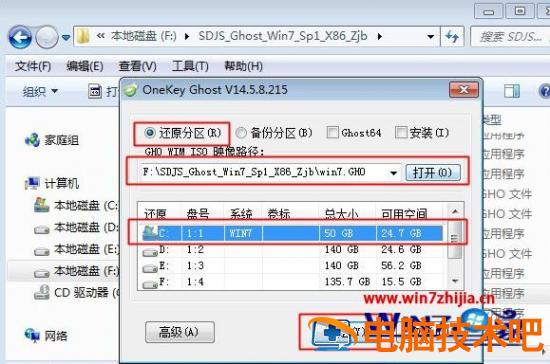 3、双击“安装系统.exe”打开Onekey Ghost,默认选择“还原分区”,映像路径是.gho,然后选择安装位置,一般是C盘,或根据大小选择,点击确定;