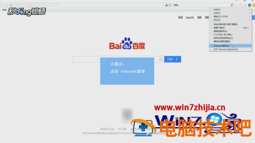 1、打开ie浏览器,点击右上方的设置图标,点击“Internet选项”。