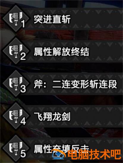 1号位突进斩和突进直斩,熟练的情况下突进直斩更好用;突进斩掏刀快,搭配斩击充能,在剑槽能量不够用时快速回复。当然一般也不用,二连变形斩回复的就够了。