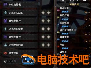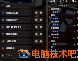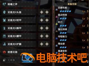 到了三星,先打几只刚缠兽(记得破坏尾巴一次)换武器,再使劲刷泥翁龙,直到刷出一整身泥翁,这时的配装
