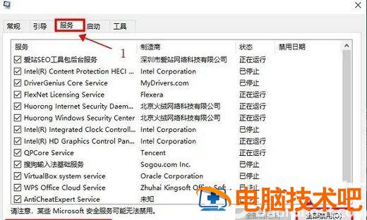 2、在打开的界面中点击上方的“服务”,然后点击左下方”隐藏所有microsoft服务”,最后单击“全部禁用”即可;