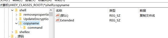 手动修改注册表在shell文件夹上面右键,新建->项->copyname,修改copyname的默认值为复制文件名