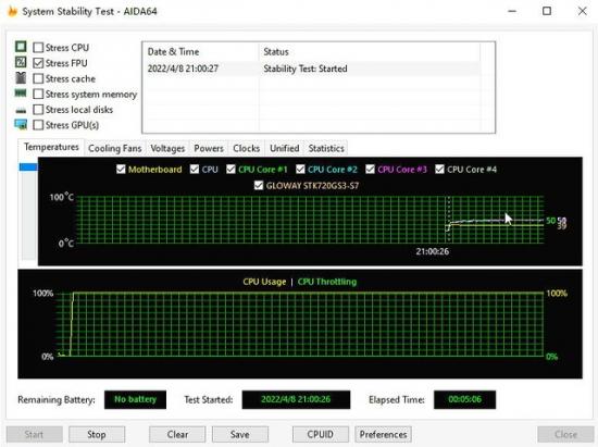 aida64单烤FPU测试下来稳得一批,对于这种低功耗U发热很小,一个风扇就能压住。