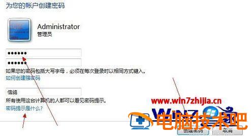 4、最后用户就可以设置开机密码了,如果你害怕自己会忘记开机密码,可以设置一个密码提示,不过这里需要注意的是,密码提示是所有人都可以看到的,设置完成后点“创建密码”就可以