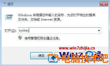 2、在运行命令的窗口里输入“Syskey”并按回车确定