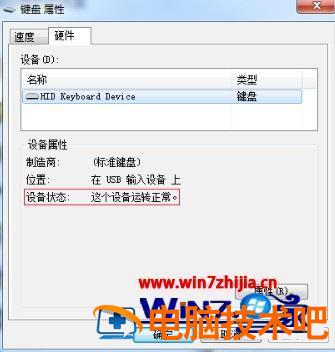 4、查看键盘设备状态是否正常运转,如果显示不正常我们就点右下角的“属性”来更新键盘驱动,最后重启就可