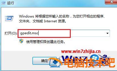 1、利用快捷键“win+R”来打开运行命令,然后在命令窗口输入“gpedit.msc”回车确定;