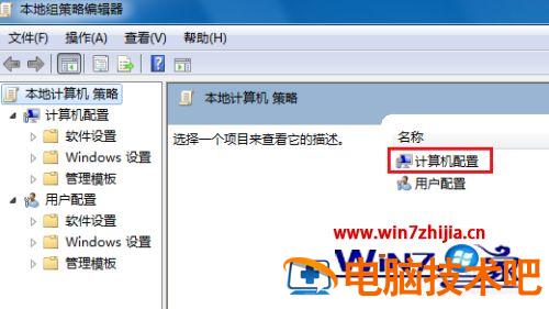 2、这时候打开了“本地组策略编辑器”,找到右边名称下方的“计算机配置”;