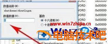 3、然后找到“shutdownwithoutlogon”,双击将数值数据改成1点确定。