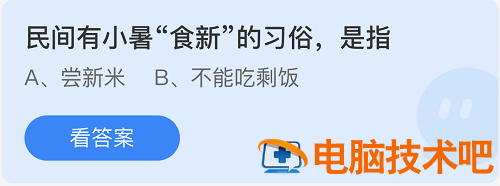 解析:“民间也保留着“食新”的习俗,即在小暑过后尝新米,人们用新收获的稻米做饭,要祭祀祖先和“五谷大神”,也会吃尝新酒。城市里一般买少量新米与老米同煮,再吃一些新上市的蔬菜等。”