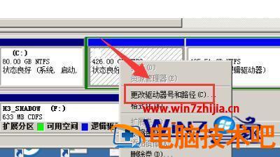 3、右键点击你需要更改的软件盘,然后去选择“更改驱动器号码和路径”,打开后选择“添加”