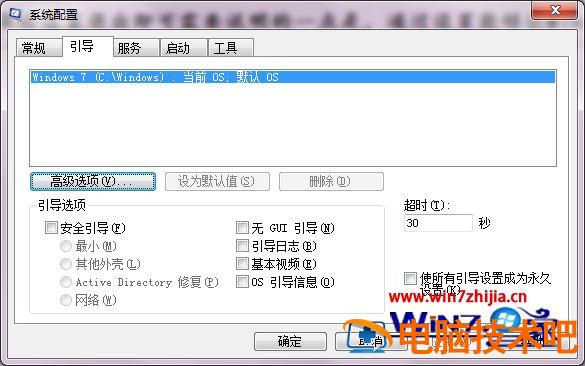 2、这时候会跳出一个显示系统配置的对话框,在这个对话框里点击“引导”然后再去点击“高级选项”