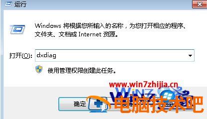 2、在运行对话框里输入“dxdiag”后点击确定