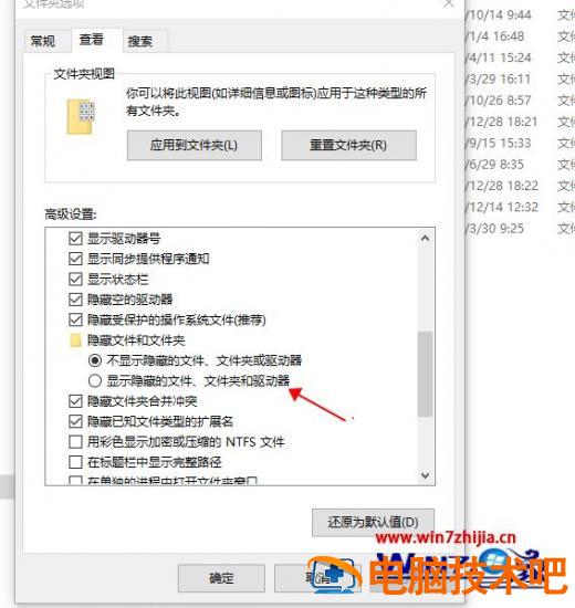 3、然后的步骤就是点击“查看”,在高级设置下找到“隐藏文件和文件夹”,然后选择“显示隐藏文件、文件夹和驱动器”后点击确定就可以
