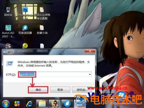 2、在弹出的运行对话框中输入“gpedit.msc”,然后单击“确定”。