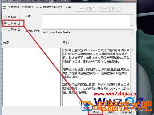 8、弹出的对话框中,选中“已启用”,然后单击确定就可以了。这样当再遇到未关闭程序时,Windows 7系统将自动终止,这样可以让关机更快。