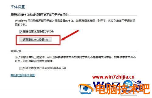4、进入后点击“还原默认字体设置”,然后“确定”,保存退出。