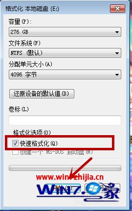 4、之后我们在里面格式化选项中,点击勾选”快速格式化“,点击下方的”开始“即可开始格式化。