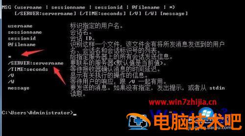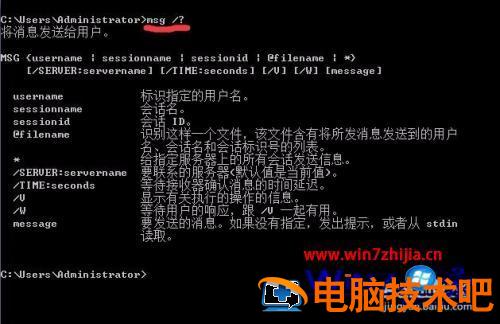 2、打开命令窗口,输入:msg /?,我们先来看一下msg命令有哪些作用。