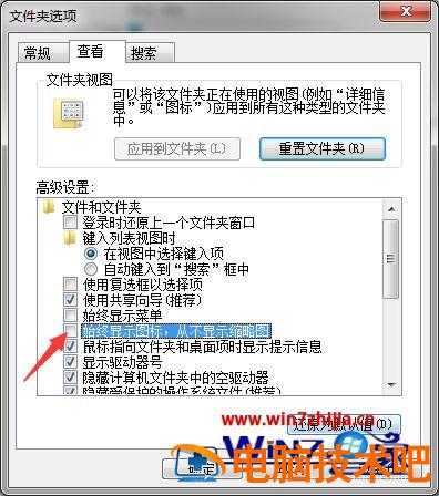4、打开查看的选项后,在高级设置中找到【始终显示图标,从不显示缩略图】。把前面的对勾去掉,然后点击确定。