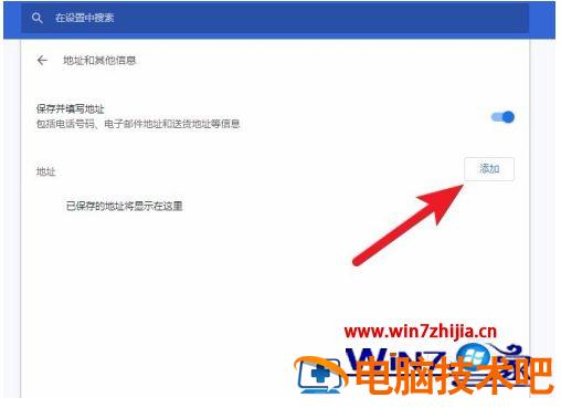 4、进入地址设置界面,打开开启开关,然后点击添加按钮。