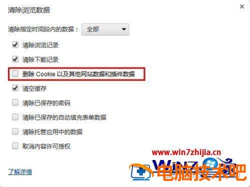 5、默认情况下删除cookie以及其他其他网站数据和插件数据是没有勾选的,如果电脑是本人自己使用,建议不要勾选,cookie是记录你的用户ID、密码的资料,如果清除了,下次就需要重新输入。