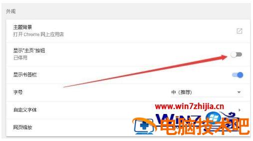 3、这时就会打开chrome浏览器的设置页面,找到“显示主页按钮”设置项,把其后面的开关设置为打开。