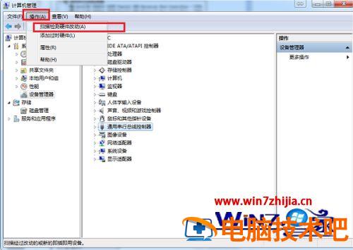 5、点击操作->扫描检测硬件改动,会自动重新安装这些usb驱动。