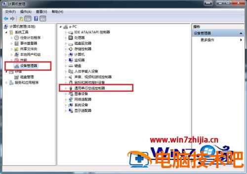 2、进去计算机管理界面之后,点击设备管理器,选择“通用串行总线控制器”。