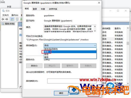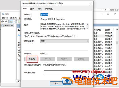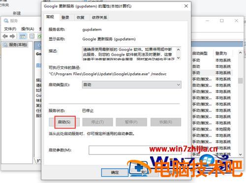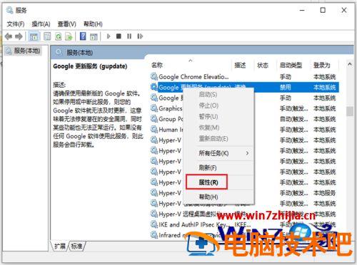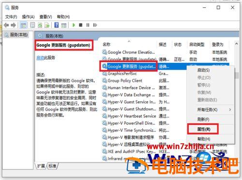 10、完成后,返回服务页面,找到“Google更新服务(gupdatem)”鼠标右击选中它,出现窗口,点击【属性】。