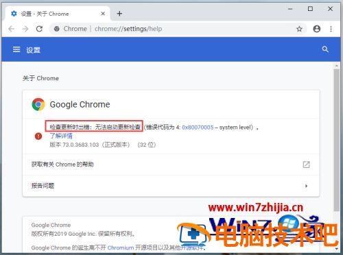 1、检查谷歌浏览器是否可以更新,发现出现以下页面,显示无法启动更新检查。