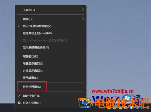 2、从电脑桌面,任务栏空白处,鼠标右击,出现对话框,点击【任务管理器】。