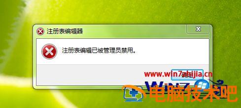8、这样,再运行win7的注册表编辑器(regedit.exe)时就会提示其已被禁用。