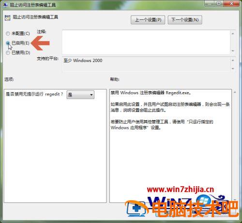 6、点击选中阻止访问注册表编辑工具对话框中的【已启用】选项。