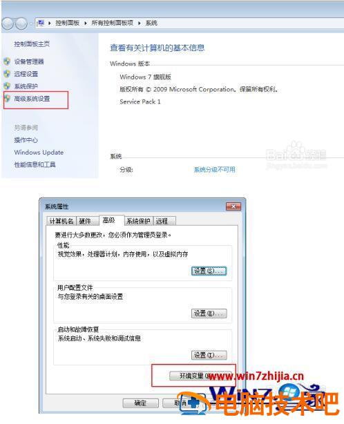 2、然后点击”高级系统设置”,再点击对话窗口下面的”环境变量”。