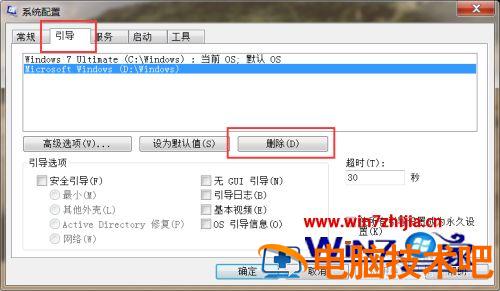 3、接下来,点击页面顶部“引导”选项卡,点击选择要删除的启动菜单项,点击底“删除”按钮。