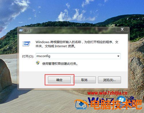2、打开运行窗口页面,在该页面中输入“msconfig”,点击“确定”按钮。