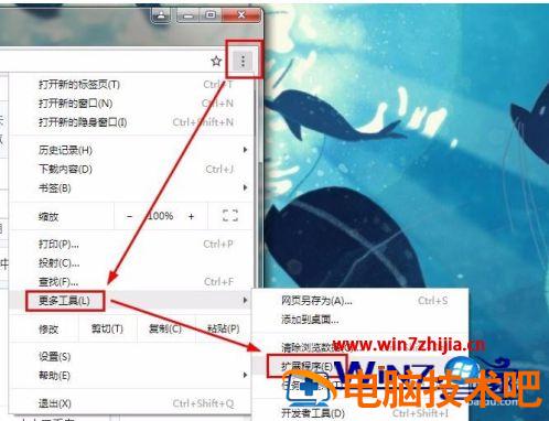 2、接下来我们打开我们的google浏览器,点击浏览器右侧的自定义按钮,然后选择更多工具下的扩展程序。