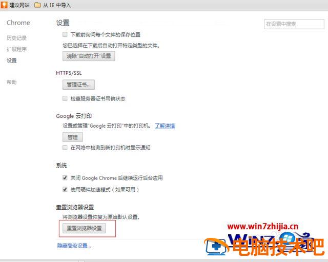 2、在设置项中,我们需要展开高级设置项,在最下面的重置浏览器设置项点击。点击后,看到可以正常使用了。可以使用说明方便有效,就不用找别的方法了。