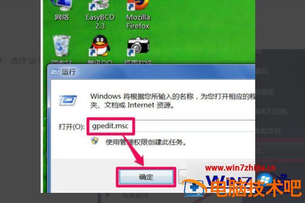 2、打开运行窗口,输入gpedit.msc命令,确定,打开组策略编辑器。