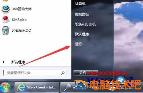 5、在Windows7桌面上,点击桌面上的开始按钮,在弹出菜单中选择“运行”菜单项。