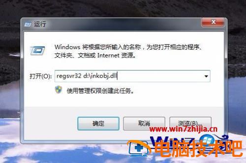 6、在打开的运行窗口中输入命令regsvr32 d:\inkboj.dll,然后按下确定按钮。