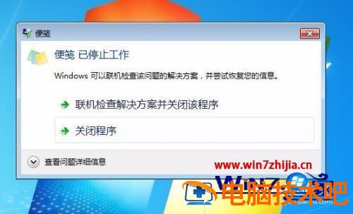 2、点击确定按钮后,就会弹出便笺已停止工作的错误提示。