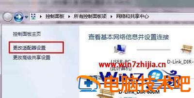 2、进入“网络和共享中心”窗口后,点击左侧的“更改适配器设置”。