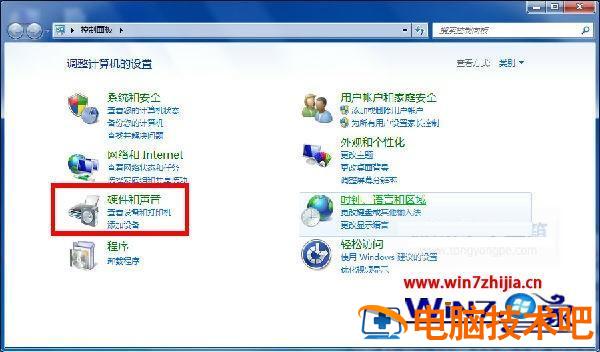 2、进入到“控制面板”界面后,点击“硬件和声音”;