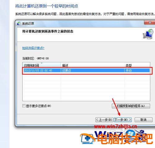 5、然后,在系统还原点的选项当中,选择一个还原点,要确保所选择的还原点是之前系统正常时的还原点,因为如果是不正常的还原点则会出现问题。