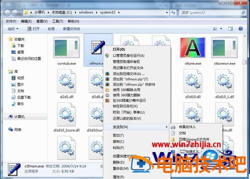 4、从上图中可以看到我没有Ctfmon这个选项,可能是优化过头直接把其删除了吧,那么我们就要使用下面这种方法了,我们打开C:\Windows\System32目录下,找到一个名为Ctfmon.exe的程序,我们在这个程序上面右键-然后选择发送到,再选择桌面快捷方式。